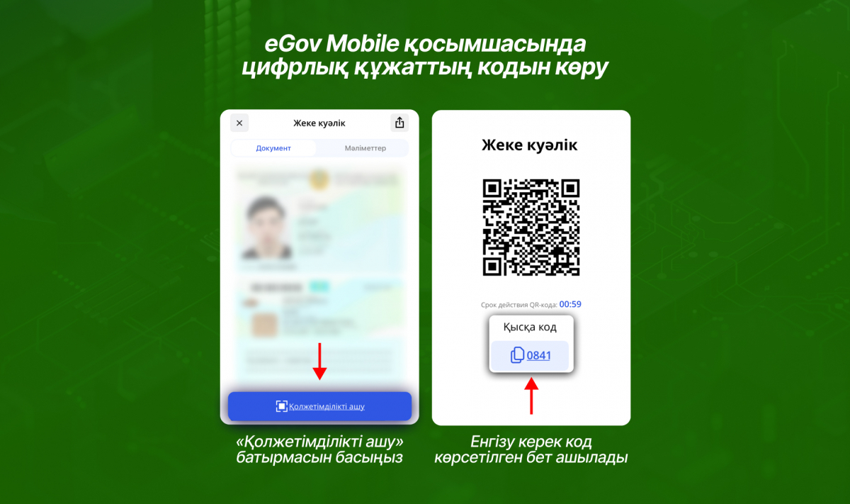 - eGov Mobile қосымшасындағы цифрлық құжаттағы кодты енгізу арқылы.